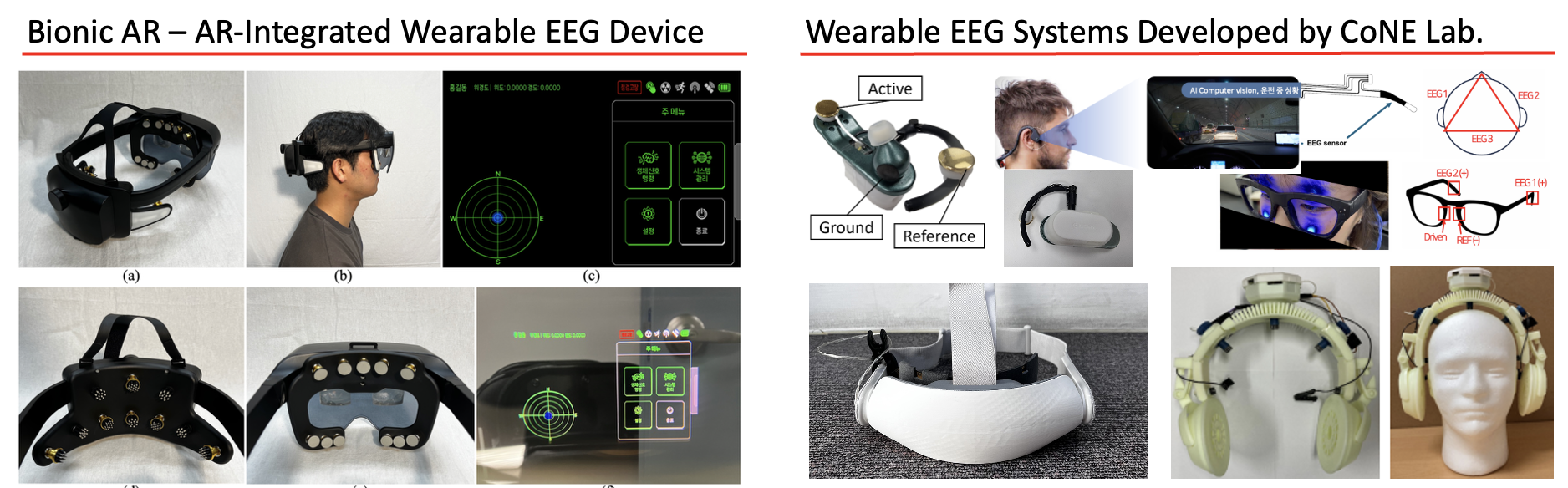 기술 중심’에서 ‘인간 중심’으로 산업 패러다임이 변화함에 따라 인터페이스 분야에서 ‘감성’이 화두로 떠오르고 있으며 이미 선진국에서는 뇌과학 및 인지과학 기술을 바탕으로 인간과 기계가 감성을 매개로 상호 교류할 수 있는 인터페이스 플랫폼을 개발하는데 박차를 가하고 있다. ‘터치’라는 감성 인터페이스를 강조한 애플社의 성공을 계기로 제스쳐 인식(MS의 Kinect), 음성 인식(Apple의 Siri) 등의 새로운 방식의 사용자 인터페이스가 등장하고 있으며 뇌-컴퓨터 접속(Brain-Computer Interface: 이후 BCI) 기술이 차세대 인터페이스 방식으로 연구되고 있다. 실제로 마이크로소프트의 키넥트(Kinect) 개발 총책임자인 앤드류 블레이크(Andrew Blake) 교수는 이미 뇌파 기반 뉴로인터페이스를 새로운 입력 인터페이스 방식으로 활용하기 위한 연구를 진행하고 있다고 밝히기도 했다. 과거에는 BCI 기술이 언어를 생성하지 못하는 신경계 손상 환자의 의사소통 대체 수단이나 뇌졸중 장애인의 재활 훈련 보조 도구, 사지마비 장애인의 신경보철을 위해 주로 연구됐으나, 적용 대상이 제한돼 있어 기업의 관심이 낮았다. 하지만 최근 들어, 구글, 필립스, 삼성전자, LG전자, SONY 등 다국적 대기업에서 일반 대중을 대상으로 한 BCI 기술의 적용에 관심을 보이기 시작하면서 전통적인 BCI 분야에서도 사용자의 뇌 상태, 인지, 감성을 추론하는 이른바 수동형 뇌-컴퓨터 접속(Passive BCI) 기술에 대한 관심이 폭발적으로 증가하고 있다. 계산지능 및 뇌공학 연구실에서는 기업 및 정부 프로젝트를 통해 다양한 형태의 웨어러블 신경인터페이스 시스템 및 수동형 BCI 기반 요소 기술을 개발하고 있다. 아래 왼쪽 그림은 본 연구실이 (주)한화시스템과 (주)와이브레인과 공동으로 설계하고 개발한 AR 디바이스와 결합된 뇌파 측정 디바이스(Bionic AR)을 보여준다 (Kim et al., IEEE Trans. Syst. Man Cybern. Syst., 2026). 아래 오른쪽 그림은 본 연구실에서 개발했거나 개발 중인 다양한 폼펙터의 웨어러블 뇌파 측정 디바이스를 보여준다.