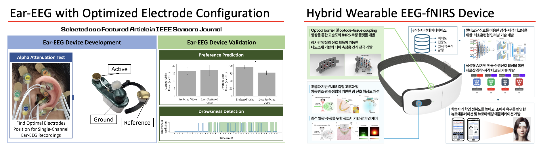본 연구실에서는 (주)삼성전자와 함께 귀 주변의 다양한 위치에서 동시에 뇌파를 측정하여 가장 sensitivity가 높은 3개의 전극 위치를 정량적인 분석을 통해 결정하였고 이를 바탕으로 귀-뇌파(ear-EEG) 측정에 최적화된 웨어러블 뇌파 측정 디바이스를 개발하였다. 이 디바이스를 이용하여 영상에 대한 선호도와 학습 중 졸음 감지를 시도하여 높은 정확도로 개인의 선호도 및 졸음 여부를 판단할 수 있음을 실증하였다. 이 결과는 IEEE Sensors Counsil에서 발행하는 IEEE Sensors Journal의 Featured Article로 선정되었다 (Kim et al., IEEE Sensors Journal, 2025). 또한 (주)한화시스템과는 AR 디바이스와 결합된 웨어러블 뇌파 측정 시스템을 개발(Kim et al., IEEE Trans. Syst. Man Cybern. Syst., 2026)하였고 (주)현대모비스와는 귀-뇌파 측정 시스템의 고도화 과정에 참여하였다. (주)LG전자와 함께 뇌파와 근적외선분광을 동시에 측정 가능한 헤드밴드형 웨어러블 장치를 개발하였으며 이를 이용한 뉴로에듀케이션 및 뉴로마케팅 어플리케이션을 개발 중에 있다.
