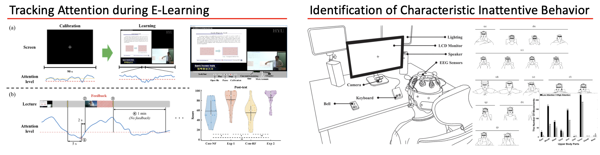 뇌 신호로부터 개인의 집중력을 추적하는 기술은 교육 분야에 적용 가능성이 매우 높은 기술이다. 본 연구실에서는 뇌파로부터 집중력 유지 능력(vigilance)을 읽어 내고 이를 이용한 인터랙티브한 교육에 적용하기 위한 기술을 연구하고 있다. 특히 ADHD 진단에 주로 활용되어 온 D2 테스트를 세계 최초로 컴퓨터 기반 테스트로 변형한 다음, 시간에 따른 집중도 변화와 상관도가 높은 뇌 영역을 탐색하고, 이를 이용한 LORETA 뉴로피드백 시스템을 개발하는데 성공했다 (Kim et al., Brain Topogr., 2017). 본 연구실에서는 이 방법을 기반으로 집중력 추정을 위해 특화된 뇌파 헤드셋을 제안하였다(Park et al., Sensors, 2020). 2023년에는 E-러닝 중 학습자의 주의력 저하를 뇌파를 통해 검출하고 이를 바탕으로 적절한 피드백을 제시하여 학습 능률을 향상시킨 연구 결과를 발표하였다 (Kim et al., IEEE Trans. Learning Technol., 2023, 아래 왼쪽 그림). 또한, 2025년에는 (주)삼성SDS와의 산학과제를 통해 초등학생들의 E-러닝 중 집중력이 저하되는 시점을 뇌파로부터 검출하고 이를 활용해 초등학생들의 특징적인 행동 양상을 밝혀내는 연구를 수행하기도 했다 (Kim et al., IEEE Trans. Learning Technol., 2025). 2023년부터 2026년까지 (주)현대모비스와 산학과제를 통해 뇌파를 이용한 운전 중 주의력 저감 검출 기술에 대한 연구를 수행하였으며 학습 중에 발생한 주의력 저감이나 졸음 이벤트를 검출하여 적절한 피드백을 제공하면 학습 결과가 향상될 수 있음을 발표하기도 했다 (Kim et al., Int. J. Hum. Comput. Interact., 2026).