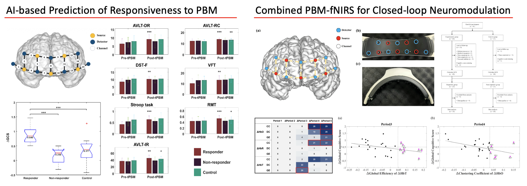 본 연구실에서는 (주)오비이랩과 공동으로 개발한 fNIRS와 PBM을 결합한 디바이스를 인지 저하가 있는 노인 환자에게 적용하여 PBM의 효과를 검증하였으며 인공지능 기술을 이용하여 PBM 이전에 측정한 fNIRS 신호로부터 PBM의 효과 유무를 사전에 예측하는 데 성공하였다 (Lee et al., IEEE Trans. Neural Syst. Rehabil. Eng., 2024; 왼쪽 그림). 또한 fNIRS와 PBM의 동시 측정 기술을 바탕으로 PBM 치료 도중에 측정된 fNIRS 신호로부터 PBM 치료를 조기 중단하는 바이오마커를 개발하였다 (Chun et al., Front. Ag. Neurosci., 2026; 오른쪽 그림)